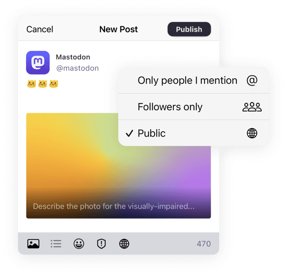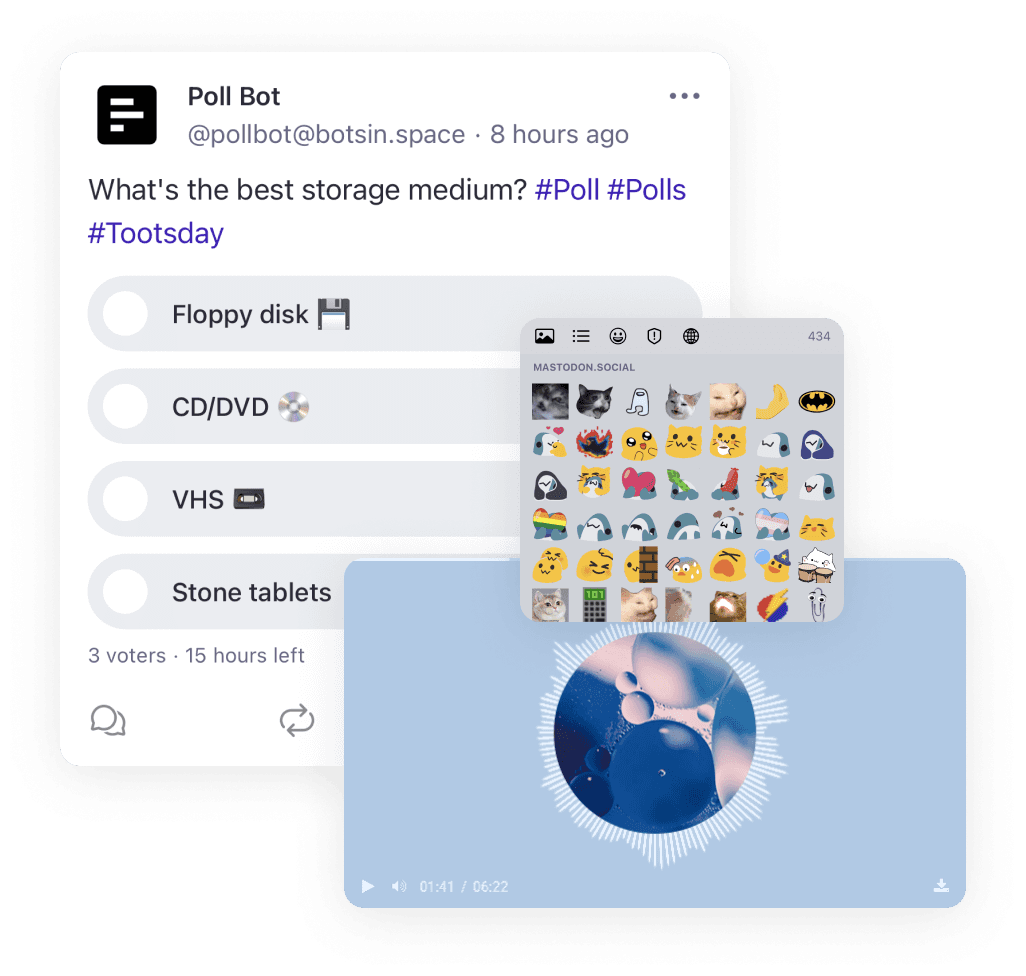 Mastodon supports audio, video and picture posts, accessibility descriptions, polls, content warnings, animated avatars, custom emojis, thumbnail crop control, and more, to help you express yourself online. Whether you're publishing your art, your music, or your podcast, Mastodon is there for you.